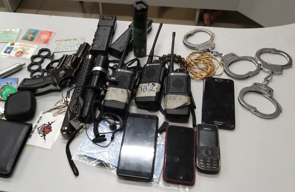 Công an thu giữ: 14 xe máy, súng rulô bắn đạn cao su, 28 viên đạn đầu cao su, giấy chứng nhận công an nhân dân giả, bảng tên công an nhân dân mang giả, bộ đàm, roi điện, còng số 8, bình xịt hơi cay…