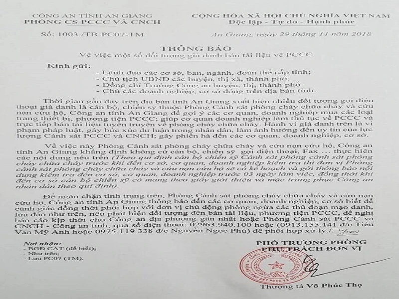 Ngày 30-11, Phòng Cảnh sát PCCC & CNCH Công an tỉnh An Giang cho biết đơn vị vừa có thông báo đến lãnh đạo các sở, ban ngành, Công an các địa phương và cơ quan, doanh nghiệp trên địa bàn tỉnh về việc cảnh giác đối với người giả danh bán tài liệu PCCC.
