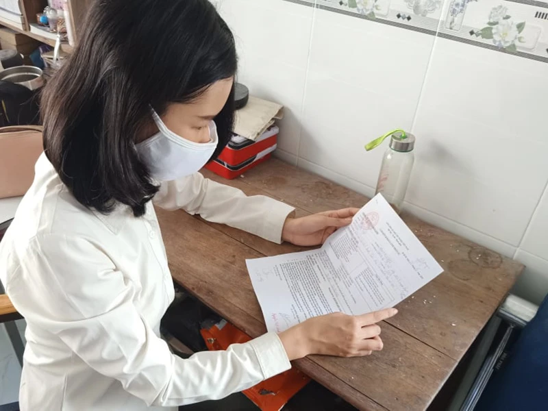 Chị V., một trong những nạn nhân đã ký bản cam kết và đóng 500.000 đồng cho nhóm tuyển dụng nhưng không xin được việc. Ảnh: TRÚC PHƯƠNG