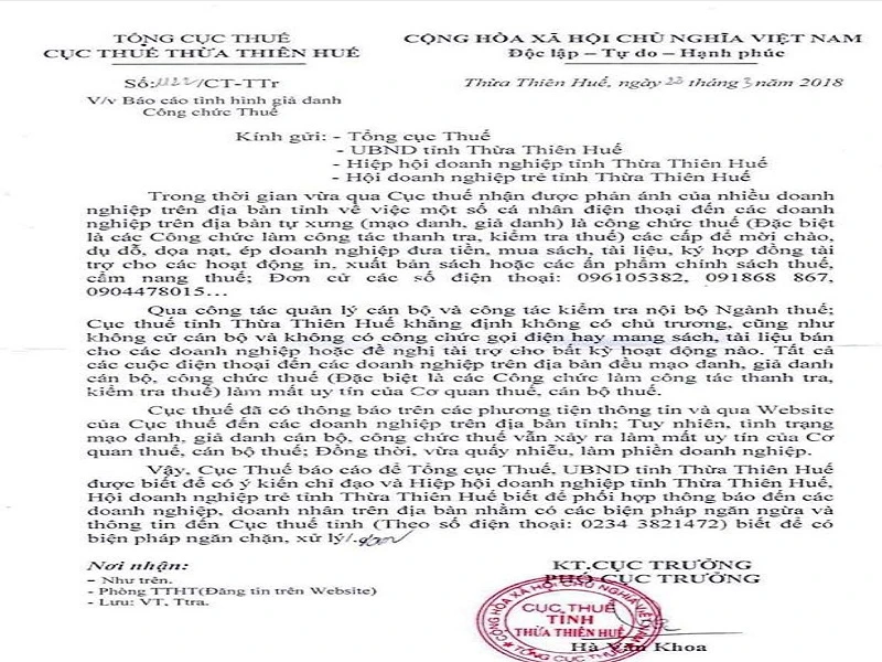 Ngày 28-3, trao đổi với báo Pháp Luật TP.HCM, ông Hà Văn Khoa, Phó Cục trưởng Cục Thuế tỉnh Thừa Thiên-Huế, cho biết đơn vị vừa có công văn gửi Tổng cục Thuế, UBND tỉnh, Hiệp hội Doanh nghiệp tỉnh và Hội Doanh nghiệp trẻ tỉnh Thừa Thiên-Huế về việc nhiều người giả danh công chức thuế.