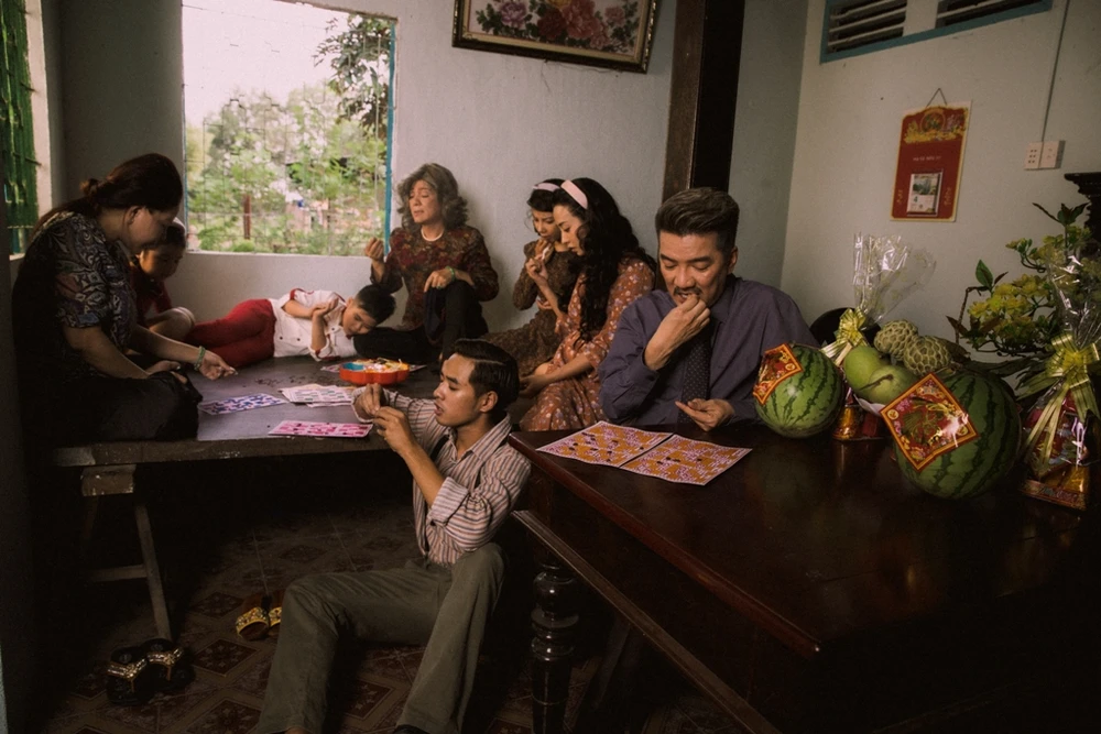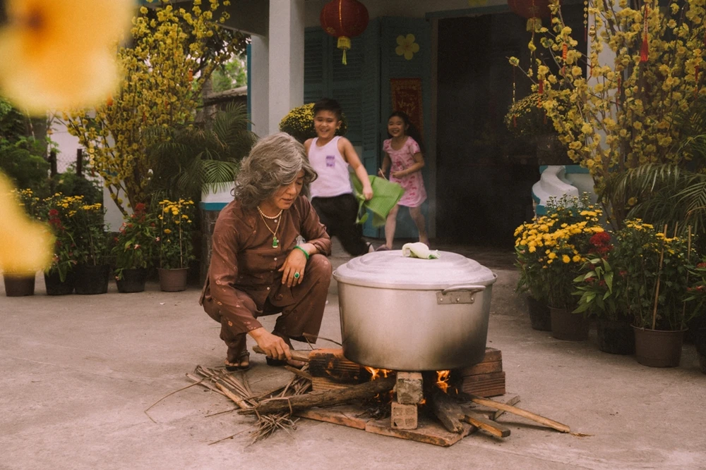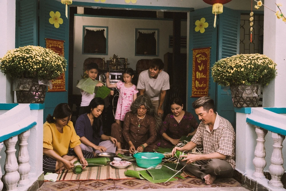Tết của Hưng tái hiện cảnh tứ đại đồng đường cùng nhau gói bánh tét. Ảnh: SEN VÀNG