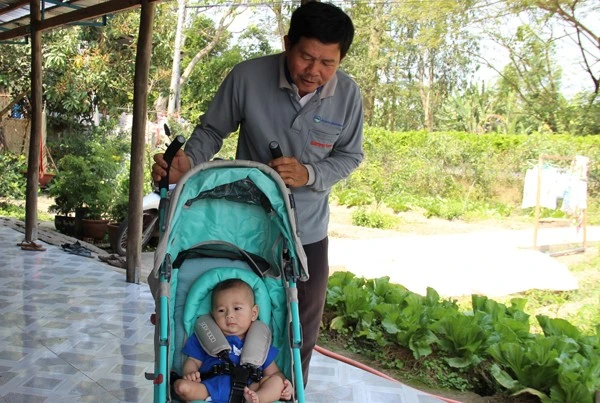 Ông Khoảnh chăm cháu Quốc Huy khi bà ngoại của bé bận bán rau ngoài chợ.