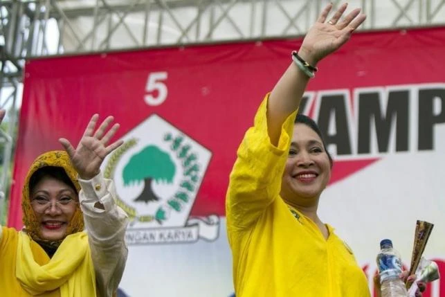 Siti Hardiyanti Rukmana (Trái) và Siti Hediati Suharto (phải) – hai người con gái của cựu Thổng thống Suharto vẫy tay chào những người ủng hộ tại chiến dịch của Đảng Golkar ở Sleman vào 20/3/2014 (Ảnh: Reuters)