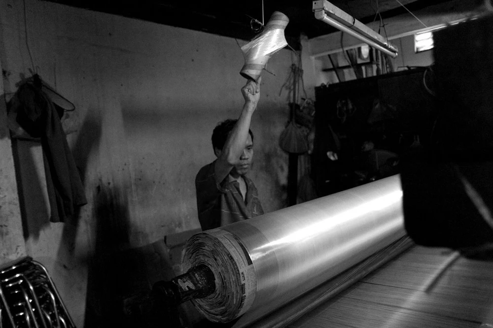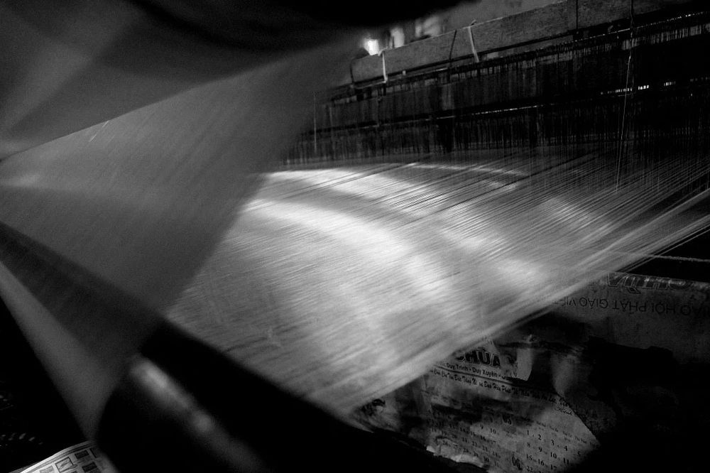 Mỗi ngày xưởng dệt gia đình anh Đông làm từ 6 giờ đến 19 giờ. Theo lời anh, dệt vải bằng khung gỗ một giờ sản xuất được 2 m vải, 1 m vải thô bán được 6.600 đồng.