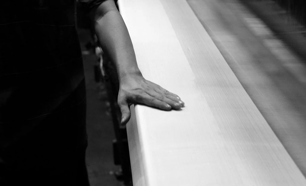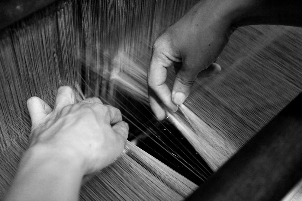 Người thợ dệt đưa bàn tay sờ lên tấm vải mịn còn trong khung dệt.