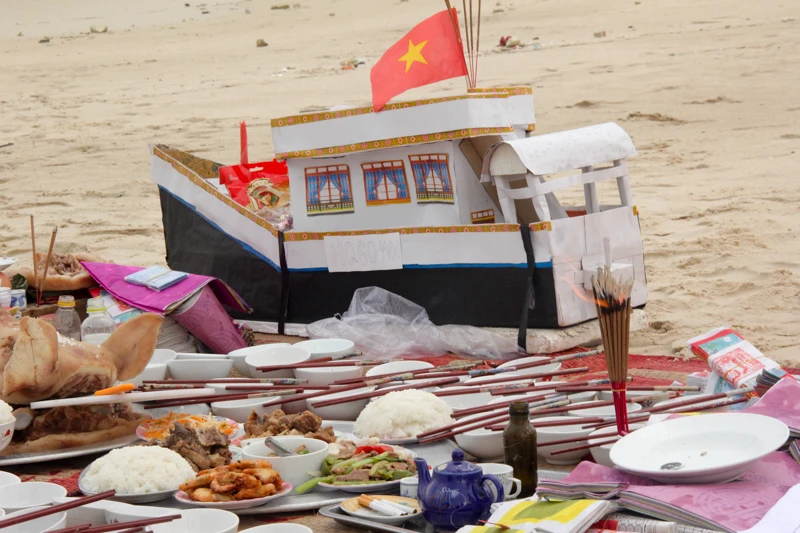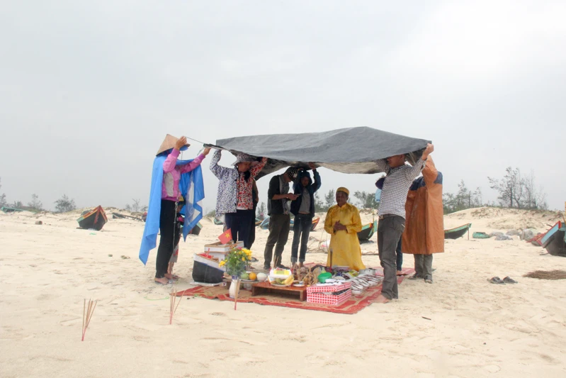Đang cúng, trời lại đổ mưa nặng hạt, gia đình phải căng bạt che mâm cỗ để tiếp tục làm lễ. Tàn hương, con tàu giấy mang số hiệu HQ-604 được anh Hoành bơi ra khơi thả, trôi khuất tầm mắt anh mới quay trở vào bờ.