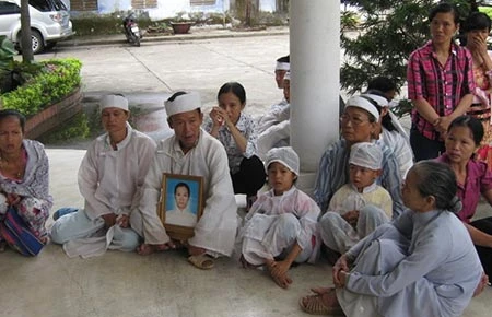 Người nhà bức xúc mang theo di ảnh chị Lê Thị Thu lên Sở Y tế tỉnh Thừa Thiên-Huế. Ảnh: VIẾT LONG