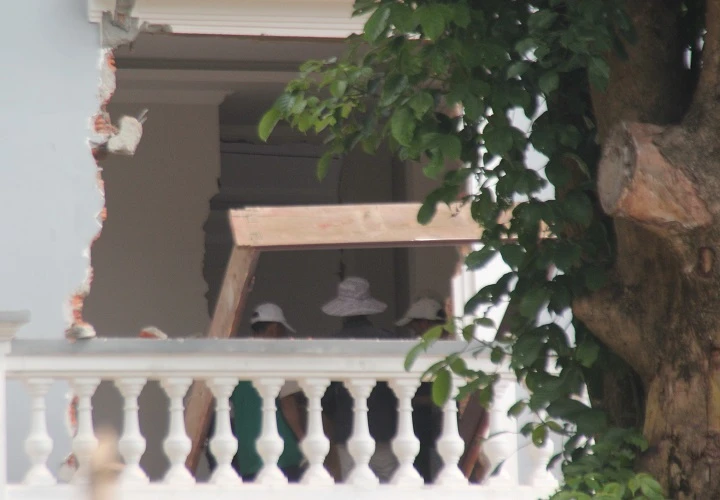 Khoảng 20 công nhân cùng máy móc được gia đình ông Thạch thuê đến để tháo dỡ căn biệt thự và một số hạng mục công trình khác vì xây dựng trái phép. Các công nhân đã dùng máy khoan, búa… đập và tháo xong một số hạng mục của công trình biệt thự.