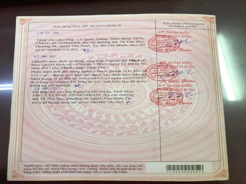 Kết quả, Chi nhánh Văn phòng Đăng ký đất đai quận Bình Tân có công văn trả lời là theo hồ sơ lưu tại chi nhánh văn phòng này thì giấy chứng nhận trên đã được cập nhật đăng ký biến động cho ông Phạm Thành Vũ tại trang 4 ngày 21-2. Trong khi đó, giấy mà bà Năng xuất trình cho CCV thể hiện đăng ký biến động cho bà Nguyễn Thị Năng ngày 29-9-2017 là không trùng khớp với thông tin hồ sơ lưu tại chi nhánh.