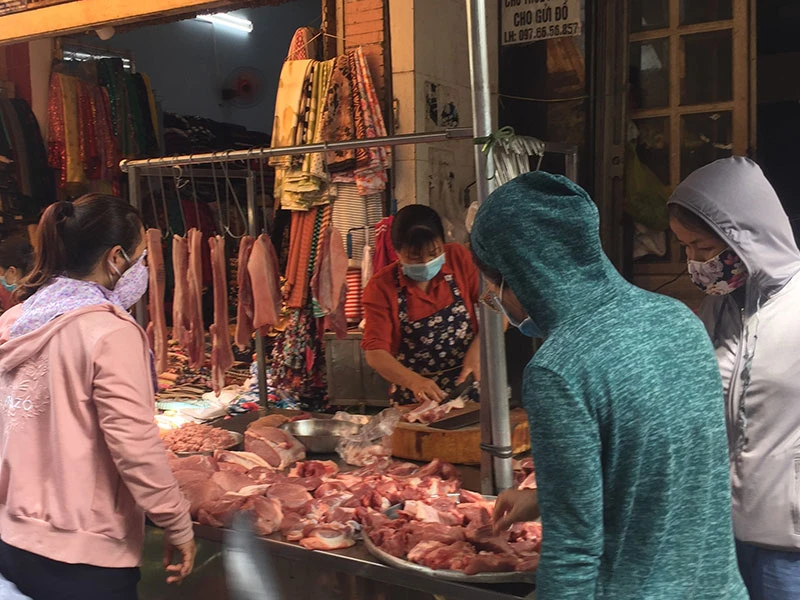 Sau một thời gian dài tăng mạnh, gần đây giá heo hơi giảm mạnh. Trong ảnh: Khách hàng đang mua thịt heo. Ảnh: TÚ UYÊN