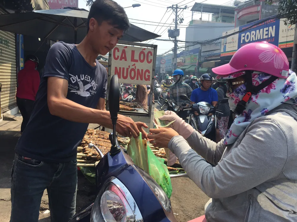 Nhiều khách hàng đứng chờ nướng cá lóc trên đường Tân Kỳ Tân Qúy