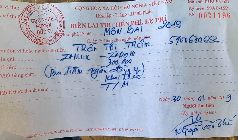 Biên lai thuế của gia đình bà Trầm. Ảnh: HN