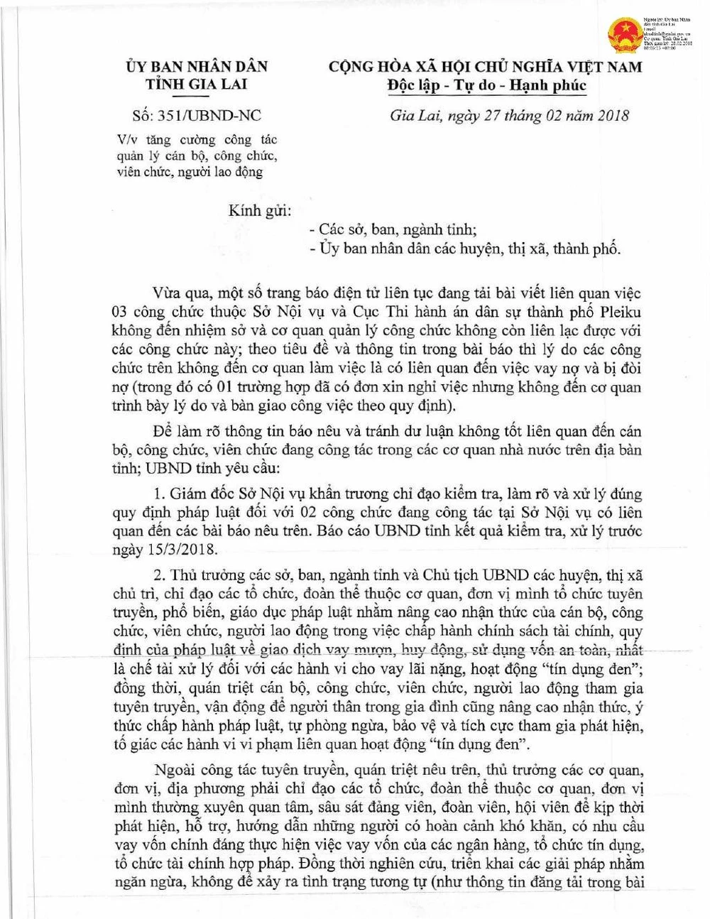 Theo công văn này, vừa qua, một số báo đăng tải bài viết liên quan việc ba công chức thuộc Sở Nội vụ và Chi cục Thi hành án dân sự TP Pleiku không đến nhiệm sở và cơ quan quản lý không còn liên lạc được với các công chức này. Theo thông tin báo chí thì lý do các công chức trên không đến cơ quan làm việc là có liên quan đến việc vay nợ và bị đòi nợ.