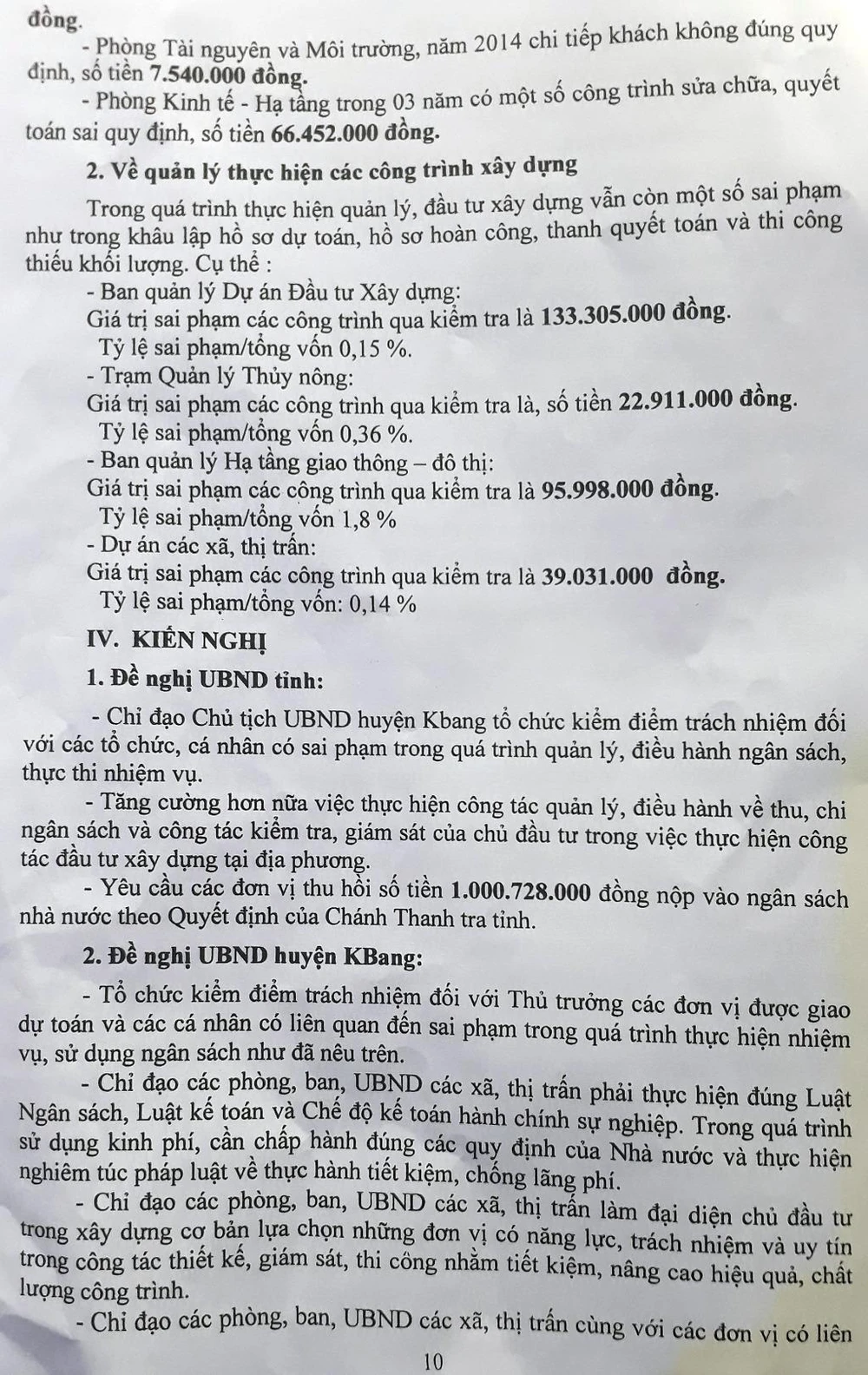 Theo Kết luận số 20/KL-TTr của Thanh tra tỉnh Gia Lai, trong ba năm (2014-2016), UBND huyện K'Bang đã có một số sai phạm như thanh toán chế độ, chính sách cho giáo viên, viên chức không đúng quy định, thanh toán tiền dạy tăng giờ không đúng quy định; Ban quản lý đầu tư-xây dựng, hạ tầng giao thông-đô thị đã lập hồ sơ dự toán, hoàn công, thanh quyết toán và thi công thiếu khối lượng...