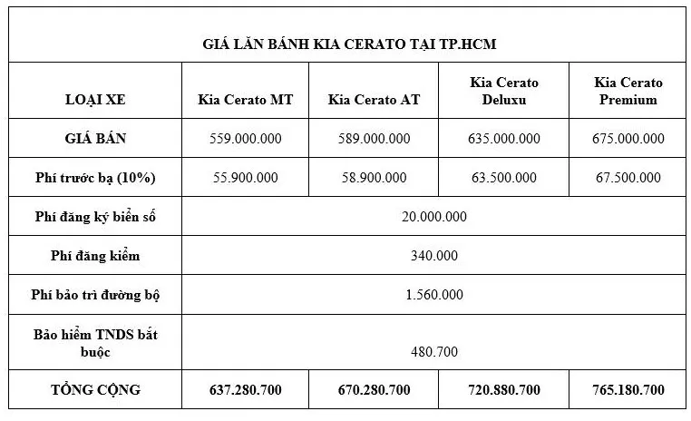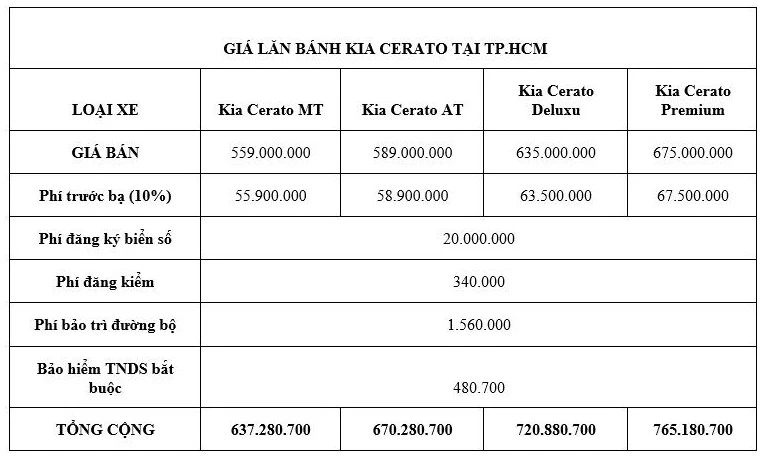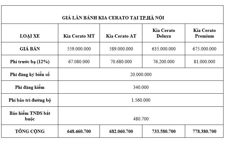 Dưới đây là chi tiết giá lăn bánh Kia Cerato 2020: