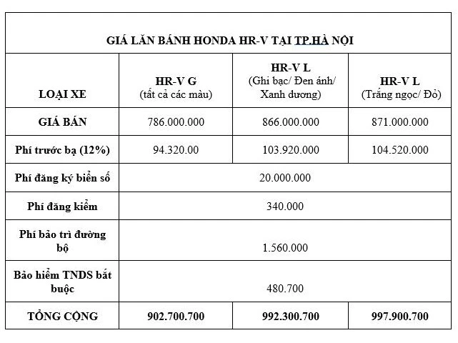 Dưới đây là chi tiết giá lăn bánh Honda HR-V:
