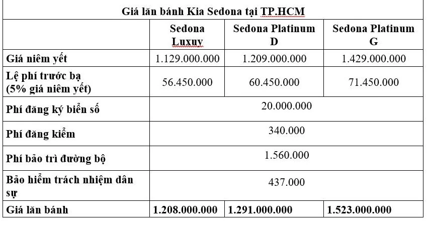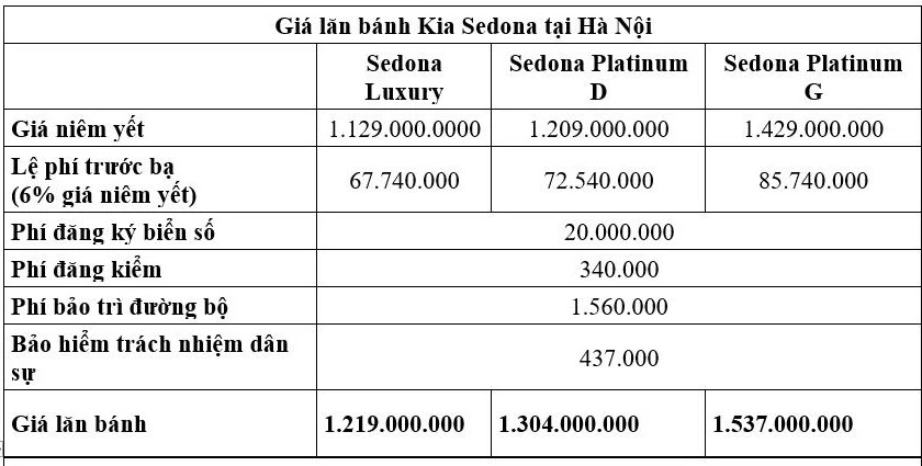 Dưới đây là chi tiết giá lăn bánh của mẫu Kia Sedona (mức giá chỉ mang tính chất tham khảo):