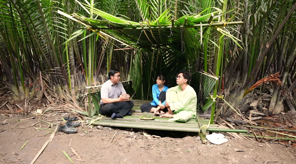 Ngồi trong mái chòi làm bằng lá dừa, Minh Dự và Gia Linh nhớ lại kỉ niệm ngày nhỏ cũng hay cùng bạn bè trong xóm làm những mái chòi như vậy để chơi, vui nhất là chơi trò “cô dâu chú rể”.