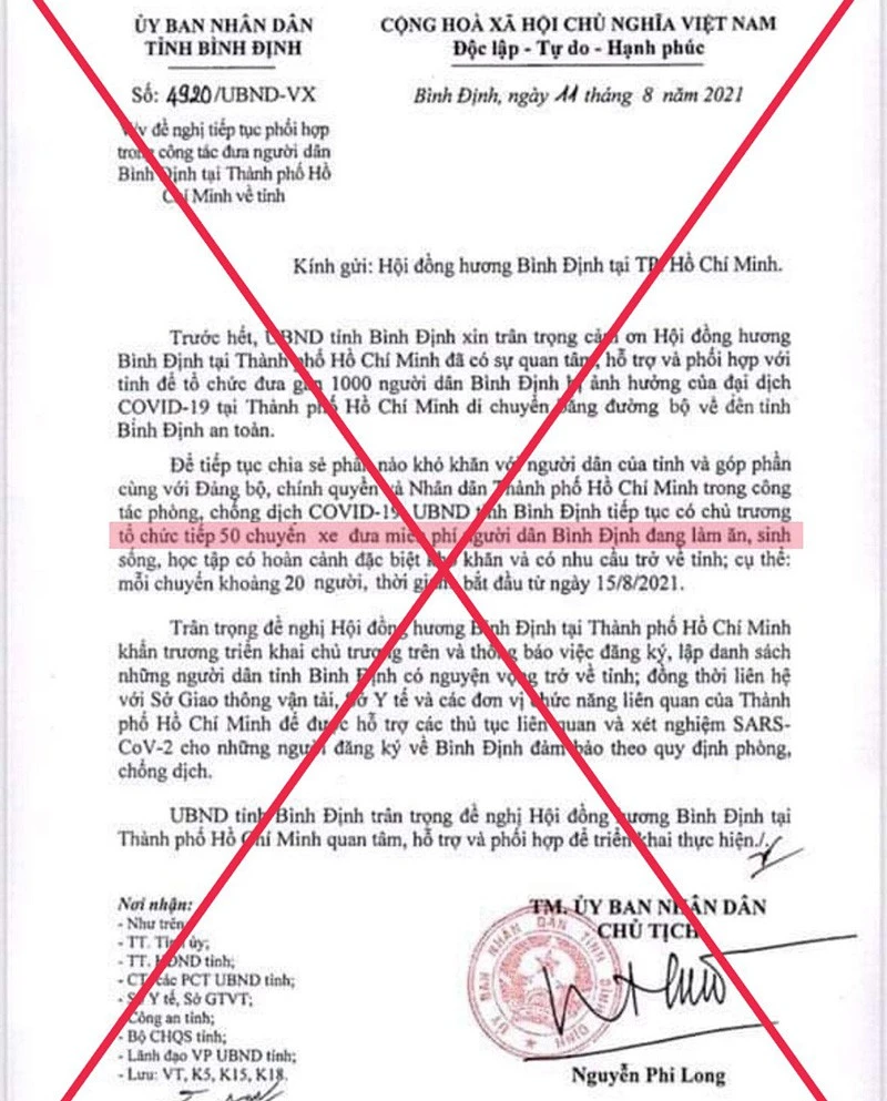 Ngày 17-8, Công an tỉnh Bình Định khẳng định công văn của tỉnh Bình Định lan truyền trên mạng xã hội (MXH) với nội dung tổ chức 50 chuyến xe chở bà con gặp khó khăn ở TP.HCM về quê là giả mạo, sai sự thật.