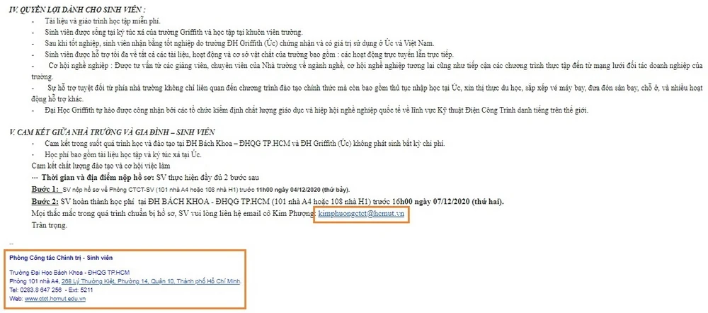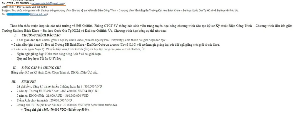 Theo đó, đối tượng lừa đảo mạo danh Trường ĐH Bách khoa gưi e-mail “Thư chúc mừng sinh viên đạt học bổng chương trình đào tạo kỹ sư Kỹ thuật Điện Công Trình – Chương trình liên kết quốc tế giữa Trường Đại học Bách Khoa – ĐH Quốc Gia TP.HCM và Đại học Griffith (Úc)” cho sinh viên, đồng thời hối thúc sinh viên đóng gần 370 triệu đồng để hoàn tất thủ tục sang Úc nhập học.