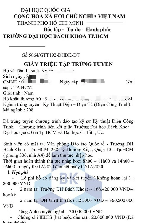 Gửi kèm với thư còn có “Giấy triệu tập trúng tuyển” và yêu cầu sinh viên phải hoàn thành học phí trước 16 giờ ngày 7-12-2020.