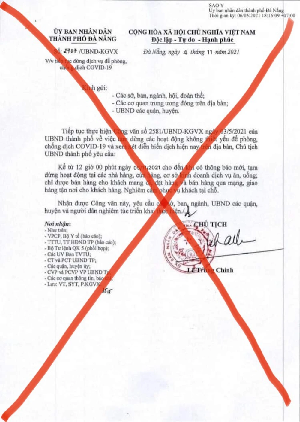 Sáng ngày 5-11, Sở TT-TT TP Đà Nẵng cho biết, trên mạng xã hội đang lan truyền một văn bản giả mạo chỉ đạo của Chủ tịch UBND TP Đà Nẵng Lê Trung Chinh về việc tiếp tục tạm dừng dịch vụ để phòng chống dịch COVID-19.