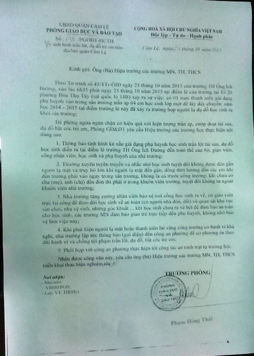 Theo công văn, sáng 23-10, tại điểm lẻ của Trường Tiểu học Ông Ích Đường (phường Hòa Thọ Tây), sát quốc lộ 14B xảy ra sự việc có một nam thanh niên giả dạng phụ huynh vào trong sân trường, trấn áp bốn em học sinh lớp 1 để lấy dây chuyền. Do sáng sớm, trong trường còn ít người nên người này lấy tài sản xong bỏ đi. Trước đó, tại điểm trường lẻ này cũng đã xảy ra trường hợp người lạ dụ dỗ học sinh ra khỏi trường.