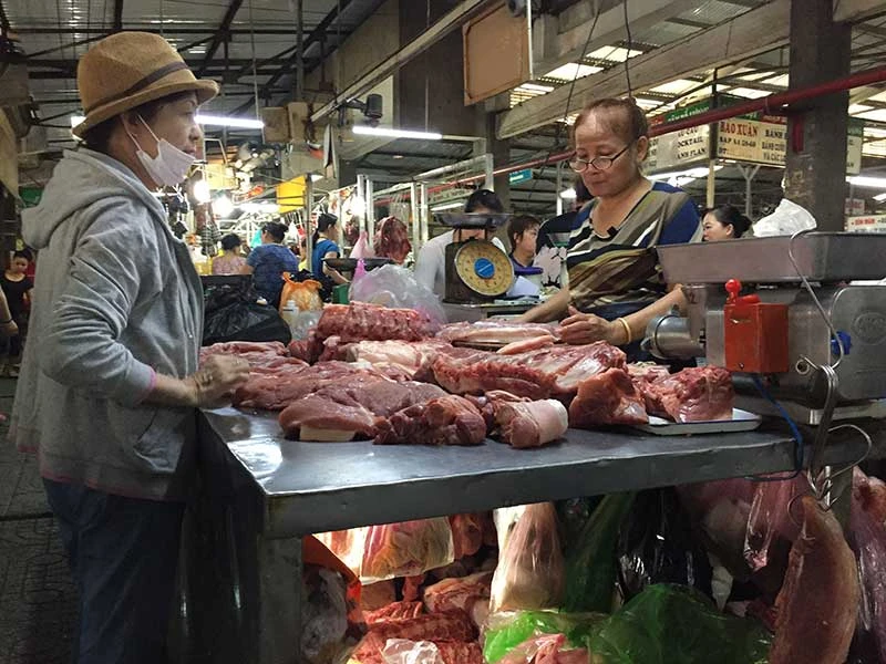 Giá thịt heo tăng cao khiến tiểu thương kinh doanh mặt hàng này ở các chợ cũng gặp khó vì sức mua yếu. Ảnh: TU