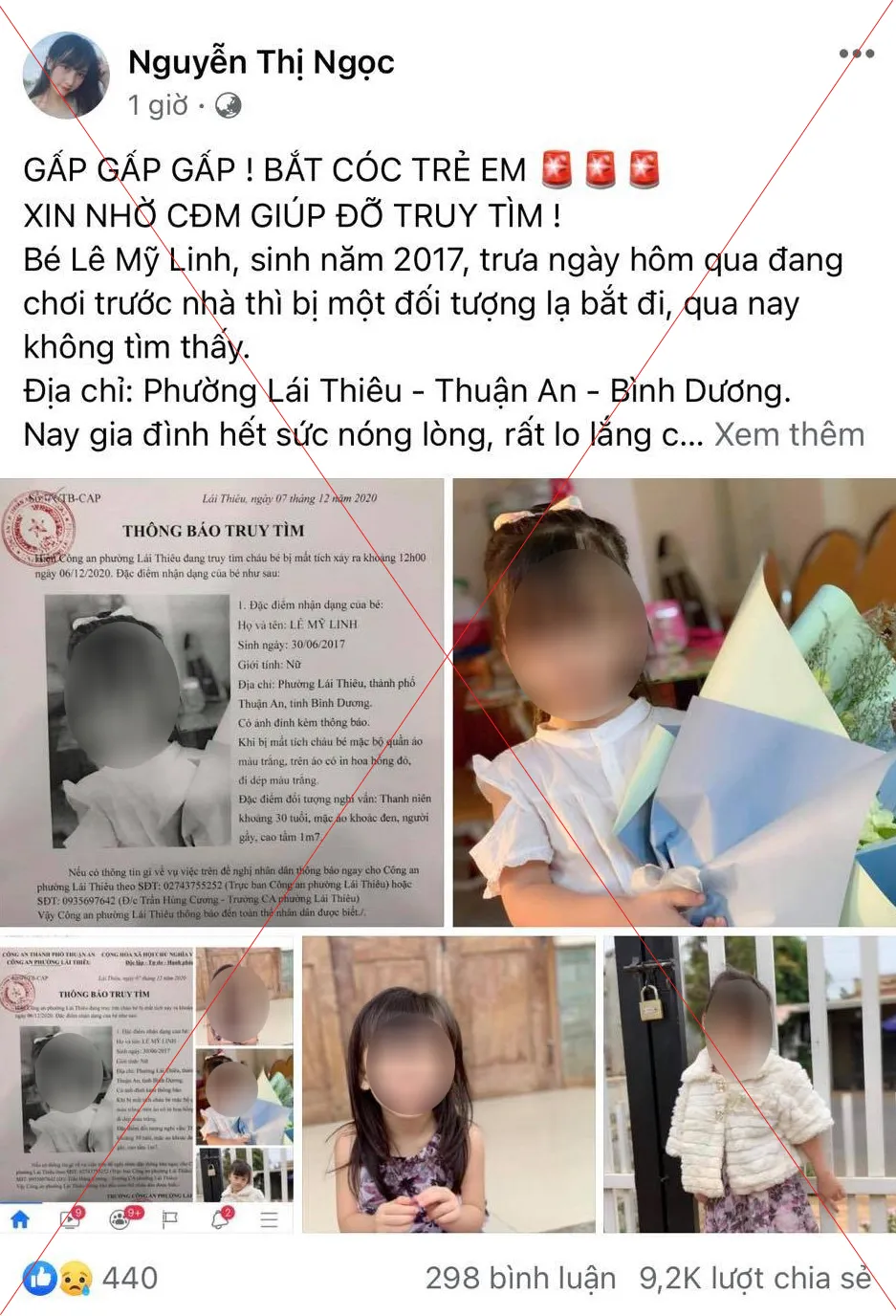 Trước đó, vào ngày 7-12, trên mạng xã hội đăng tải một trạng thái thông tin một bé gái tại phường Lái Thiêu bị bắt cóc. Kèm theo một thông báo có ký tên và đóng dấu của Công an phường Lái thiêu.