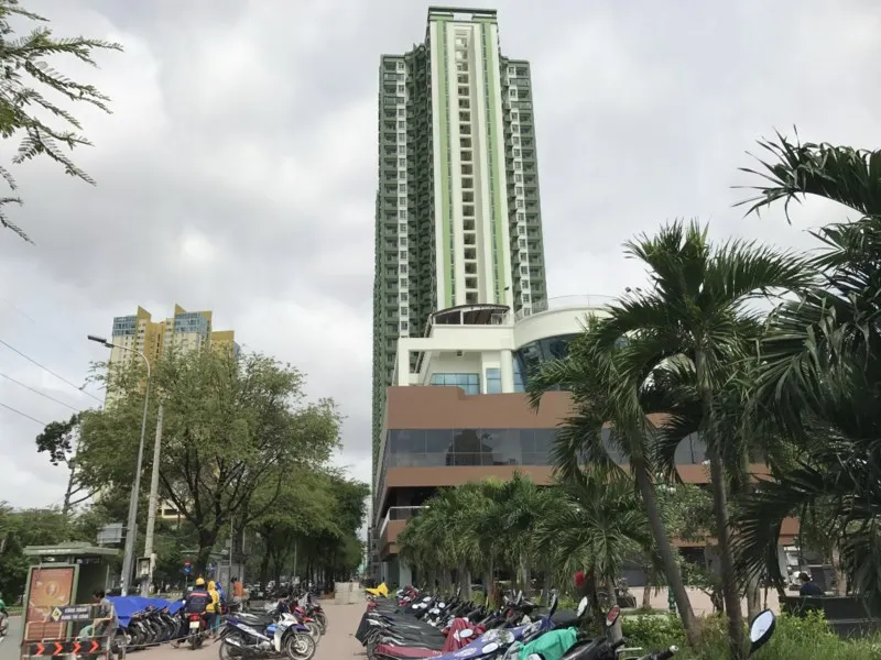 Tòa nhà Thuận Kiều Plaza đã được đổi “áo” màu xanh sau gần 20 năm mặc “áo” đỏ. Ảnh: VIỆT HOA