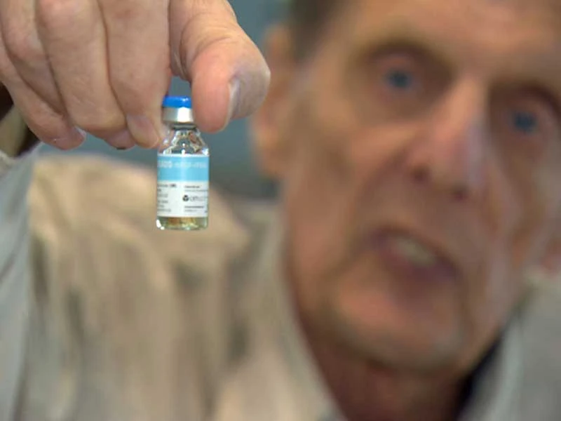 Mick Phillips, bệnh nhân Mỹ sống tại bang Wiscosin, cầm trên tay lọ vaccine Cimavax mà ông mua được từ Cuba. Chính bác sĩ của ông đã đề nghị ông nên tìm loại thuốc này. Ảnh: CBC