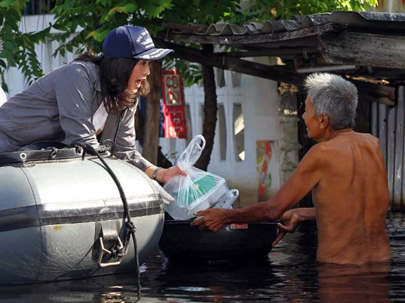Bà Yingluck phân phát thực phẩm cho người dân vùng Bắc Thái Lan trong chuyến thị sát các khu vực bị lũ lụt tàn phá hồi 3-11-2011. Ảnh: AFP