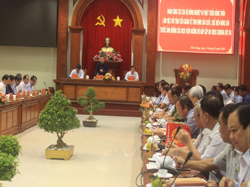 Sáng 11-2, Bộ trưởng Bộ NN&PTNT Nguyễn Xuân Cường cùng đoàn công tác Bộ NN&PTNT làm việc với tỉnh Tiền Giang về tình hình sản xuất, chế biến nông sản trước ảnh hưởng của dịch bệnh viêm đường hô hấp do virus nCoV gây ra. Bộ trưởng yêu cầu việc xử lý hàng nông sản còn tồn đọng, trước mắt cần tập trung tiêu thụ nội địa.