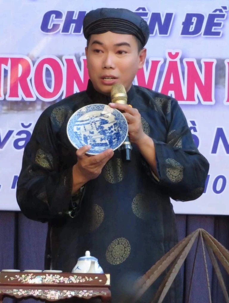 Diễn giả Hồ Nhựt Quang nói về giá trị chữ ơn của Nam bộ ẩn trong vành nón lá, kỷ trà, chén đĩa xưa. Ảnh: NGỌC DU PHẠM