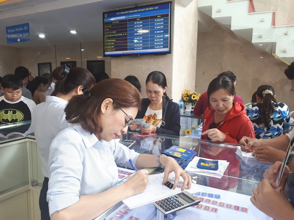Khách hàng mua vàng miếng luôn phải xếp hàng, tốn thời gian hơn so với việc mua vàng Thần tài