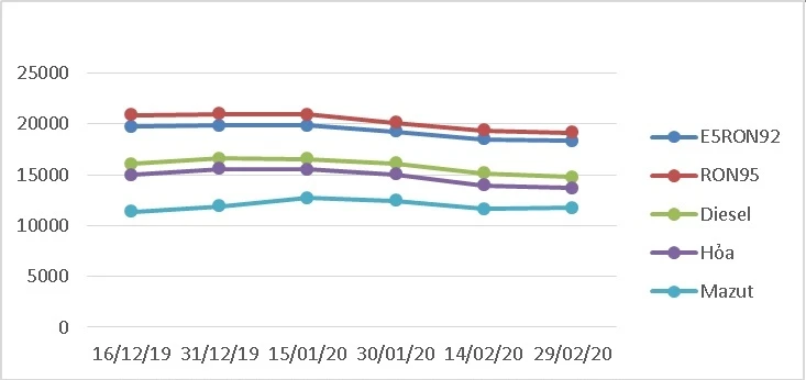 Biến động giá bán lẻ xăng dầu trong nước tháng 12-2019 - tháng 2-2020.