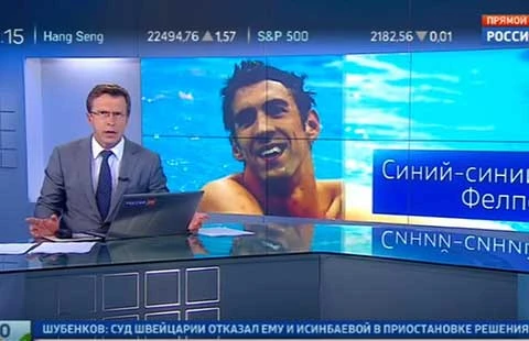 Kênh truyền hình Nga liên hệ việc Phelps giác hơi với scandal về doping mới đây của nước này. Ảnh:YOUTUBE