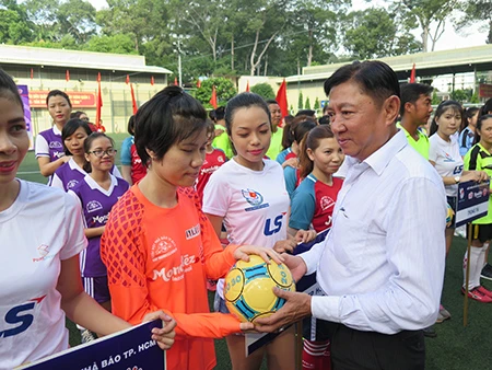 Ông Nguyễn Hùng, Phó Giám đốc Sở VH-TT TP.HCM, trao quà lưu niệm cho các đội bóng dự giải.