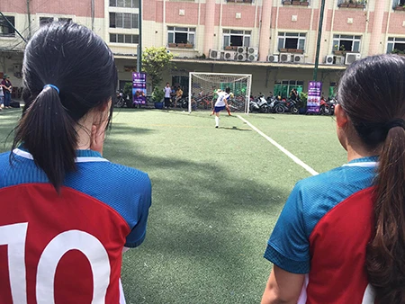 Cầu thủ nữ SCTV hồi hộp theo dõi cú sút luân lưu quyết định của Việt Anh (HTV) sau khi hai đội hòa nhau 3-3 ở hai hiệp đấu chính.