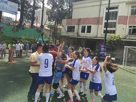 Niềm vui vỡ òa của các cô gái HTV khi vượt qua đối thủ nặng ký SCTV dưới sự huấn luyện bài bản của cựu tuyển thủ Lưu Ngọc Mai cùng một số học trò dày dạn kinh nghiệm.