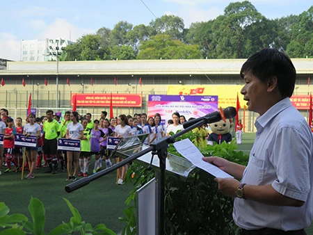 Tổng Biên tập báo Công An TP.HCM Trần Trọng Dũng tuyên bố khai mạc giải bóng đá mini Hội Nhà báo TP.HCM 2016.