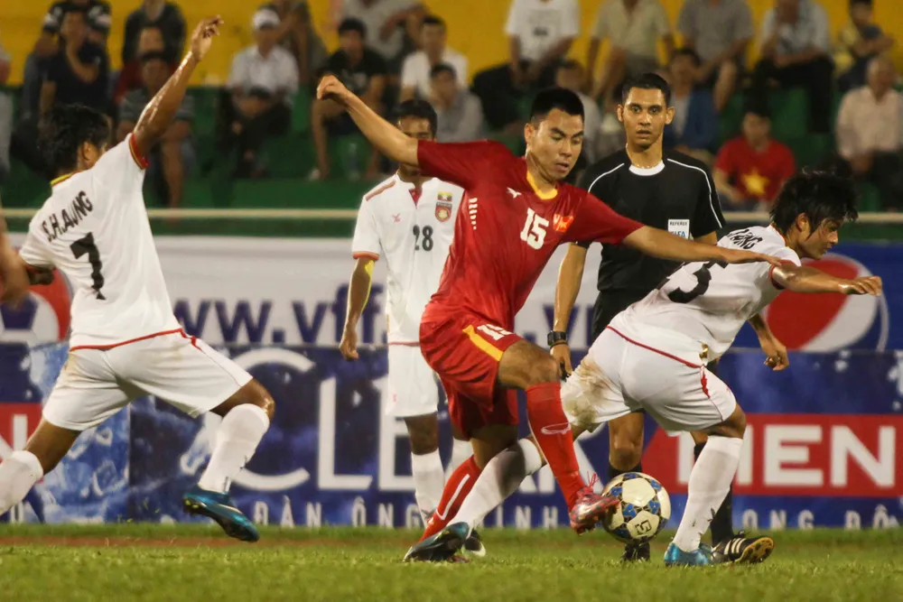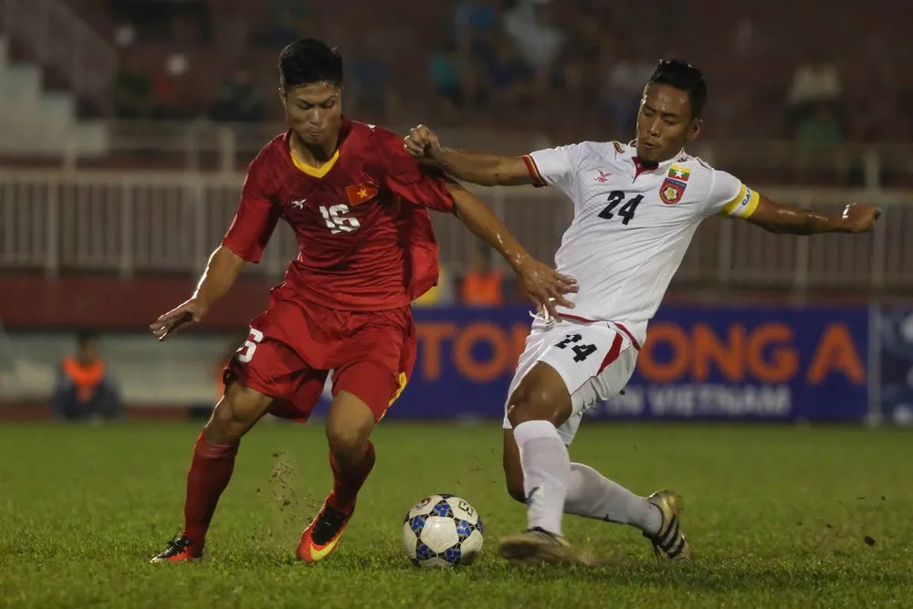 Đức Huy (15) trong pha tranh chấp với cầu thủ Myanmar. Ảnh: Phạm Huy