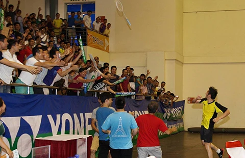Tiến Minh phấn khích với chức vô địch đã ném vợt lên khán đài tặng khán giả. Ảnh: CMQ