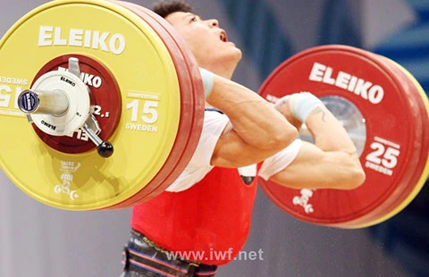 Thạch Kim Tuấn ở nội dung cử đẩy. Ảnh: IWF.net