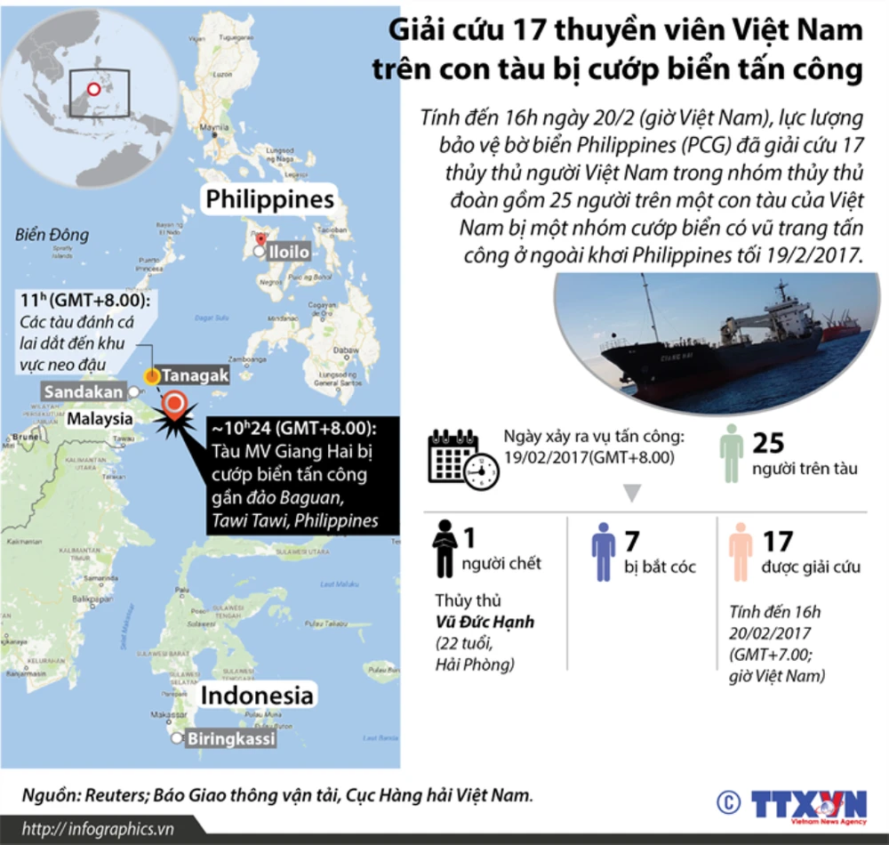 16 giờ ngày 20-2 (giờ Việt Nam), lực lượng bảo vệ bờ biển Philippines (PCG) đã giải cứu 17 thủy thủ Việt Nam trong nhóm thủy thủ đoàn gồm 25 người trên tàu của Việt Nam bị một nhóm cướp biển có vũ trang tấn công ở ngoài khơi Philippines tối 19-2-2017.