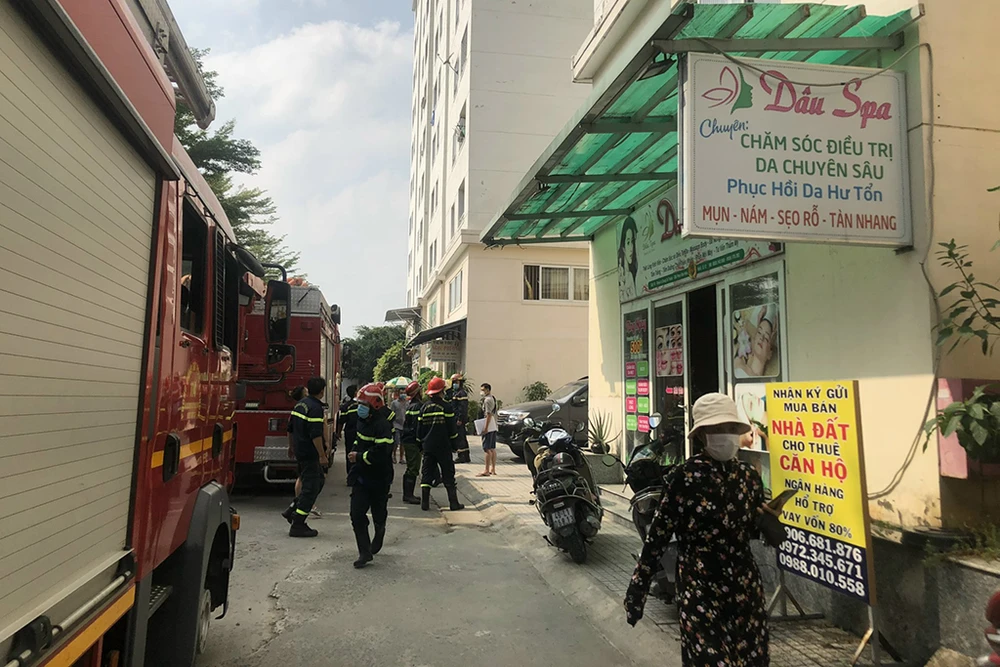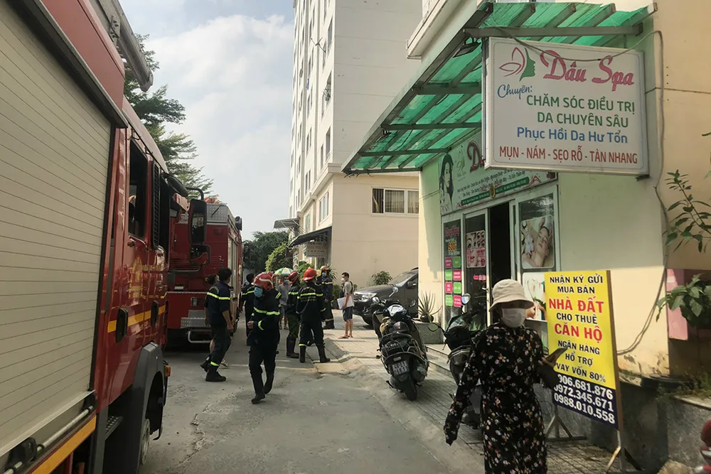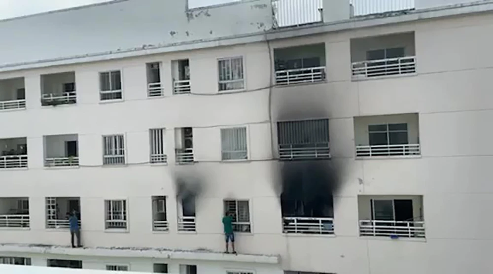 Tại hiện trường, khói đen kịt lan sang các căn hộ lân cận. Cư dân ở các block gần đó hô hoán, hoảng loạn trong khi hai người đàn ông thóat ra từ cửa sổ, bám ở lan can ở độ cao hàng chục mét.