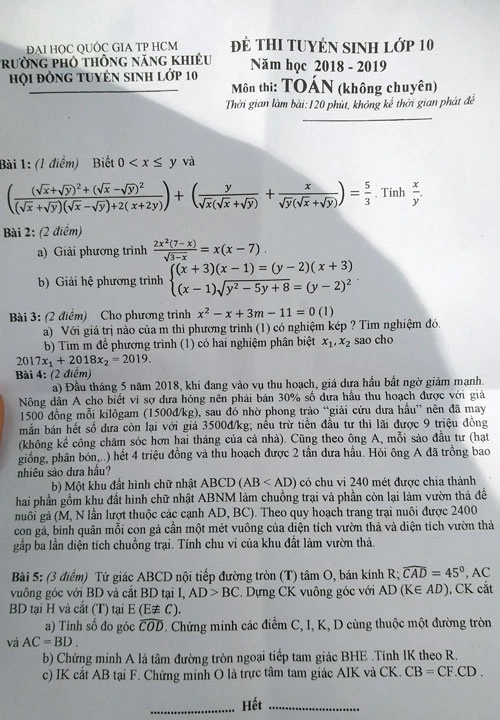 Đề thi toán vào lớp 10 Phổ thông Năng khiếu
