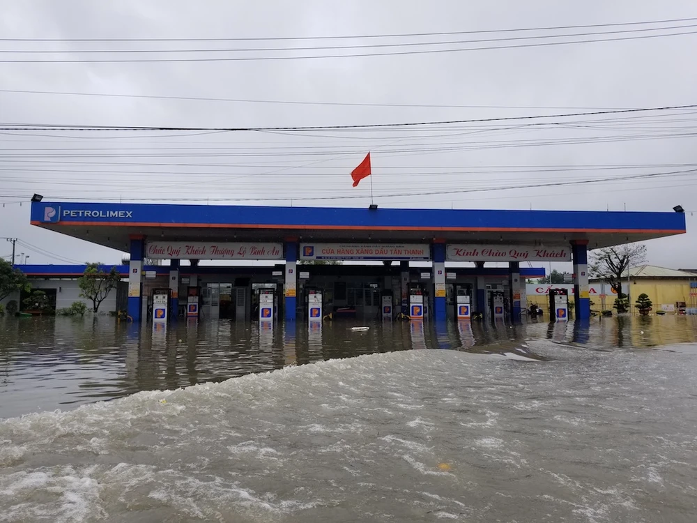 Cây xăng Tân Thạnh (TP Tam Kỳ) ngập sâu trong nước. Ảnh: Thanh Nhật