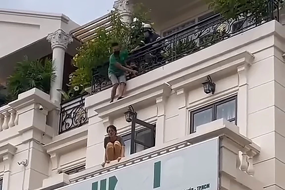 Một người dân gần đó đã trèo lên tầng ba ngôi nhà, nhẹ nhàng tiếp cận từ phía sau ôm chặt lấy cô gái và phối hợp với hai cảnh sát PCCC thành công trong việc giải cứu.