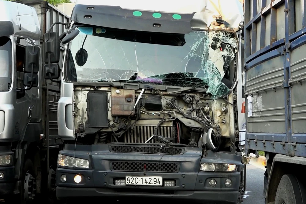Đầu xe tải biến dạng. Ảnh: HẢI HIẾU